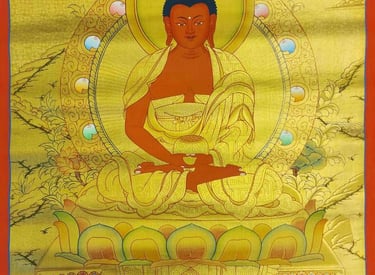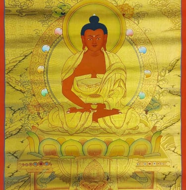 Elegant thangka painting hanging on a textured wall, bathed in soft light to highlight its vibrant traditional motifs.